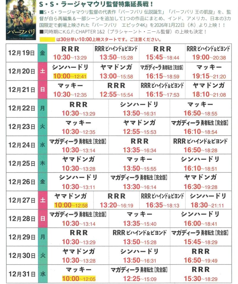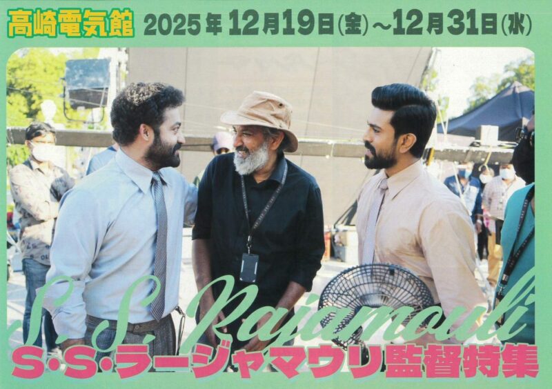 2025.11.20 2025年12月19日(金)~ 12月31日(水) S・S・ラージャマウリ監督特集 高崎電気館 たかさきコミュニティシネマ 2025年12月19日(金)〜12月31日(水) 上映料金 ※税込み 一般=1,500円/シニア(60歳以上・自己申告)=1,100円 /シネマテークたかさき会員・25歳以下=1,200円/高校生以下・障がい者手帳をお持ちの方、付き添いの方1名=1,000円 ※専用駐車場はございません。公共の交通機関をお使いになるか、お近くのコインパーキングをご利用ください。 ※当日付の高崎市内の駐車券、または駐車証明書をチケット購入時にご提示いただくと1名様の映画鑑賞券を100円割引いたします。 上映作品や上映時間、料金など詳しい内容はこちら Tweet 2025.4.01 たかさきコミュニティシネマ 特定非営利活動法人たかさきコミュニティシネマ について 2025.12.03 たかさきコミュニティシネマ 2026年1月16日 (金)・17日(土) 星と映画の夜 高崎電気館 2025.11.29 たかさきコミュニティシネマ 2025年12月13日(土)・14日(日)高崎電気館祭 クリスマス上映会 高崎電気館 2025.11.20 シネマテークたかさき 2025年12月5日(金)~11日(木)開館21周年記念 BOMシリーズ Vol.18 more