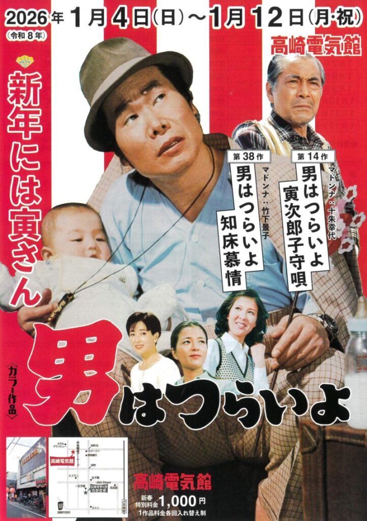 2025.12.18 2026年1月4日(日)〜1月12日(月・祝) 男はつらいよ 新春上映2026 高崎電気館 たかさきコミュニティシネマ 2026年 1月4日(日)〜1月12日(月・祝) 開場 10時30分より 【鑑賞料金】 1作品:1,000円 各回入れ替え制 ・専用駐車場はございません。公共の交通機関をお使いになるか、お近くのコインパーキングをご利用ください。 ・当日付の高崎市内の駐車券、または駐車証明書をチケット購入時にご提示いただくと1名様の映画鑑賞券を100円割引いたします。 上映作品や上映時間、料金など詳しい内容はこちら Tweet 2025.4.01 たかさきコミュニティシネマ 特定非営利活動法人たかさきコミュニティシネマ について 2025.12.18 たかさきコミュニティシネマ 2026年1月22日(木)~ 2月1日(日) インド映画特集2026冬 高崎電気館 2025.12.18 たかさきコミュニティシネマ 2026年1月4日(日)〜1月12日(月・祝) 男はつらいよ 新春上映2026 高崎電気館 2025.12.03 たかさきコミュニティシネマ 2026年1月16日 (金)・17日(土) 星と映画の夜 高崎電気館 more